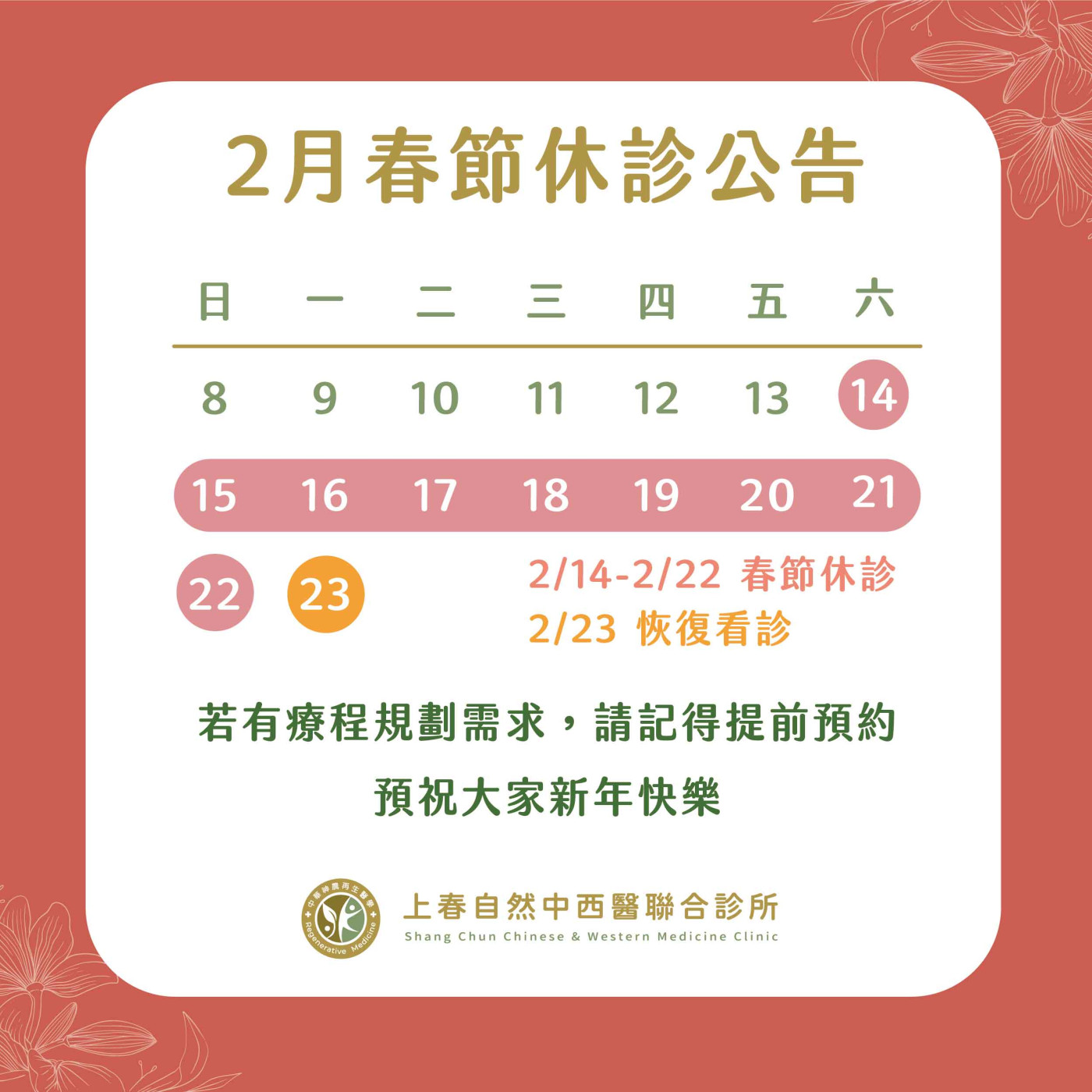 親愛的朋友,本診所將於 2/14(六)– 2/22(日)春節期間休診,並於 2/23(一)恢復正常看診。