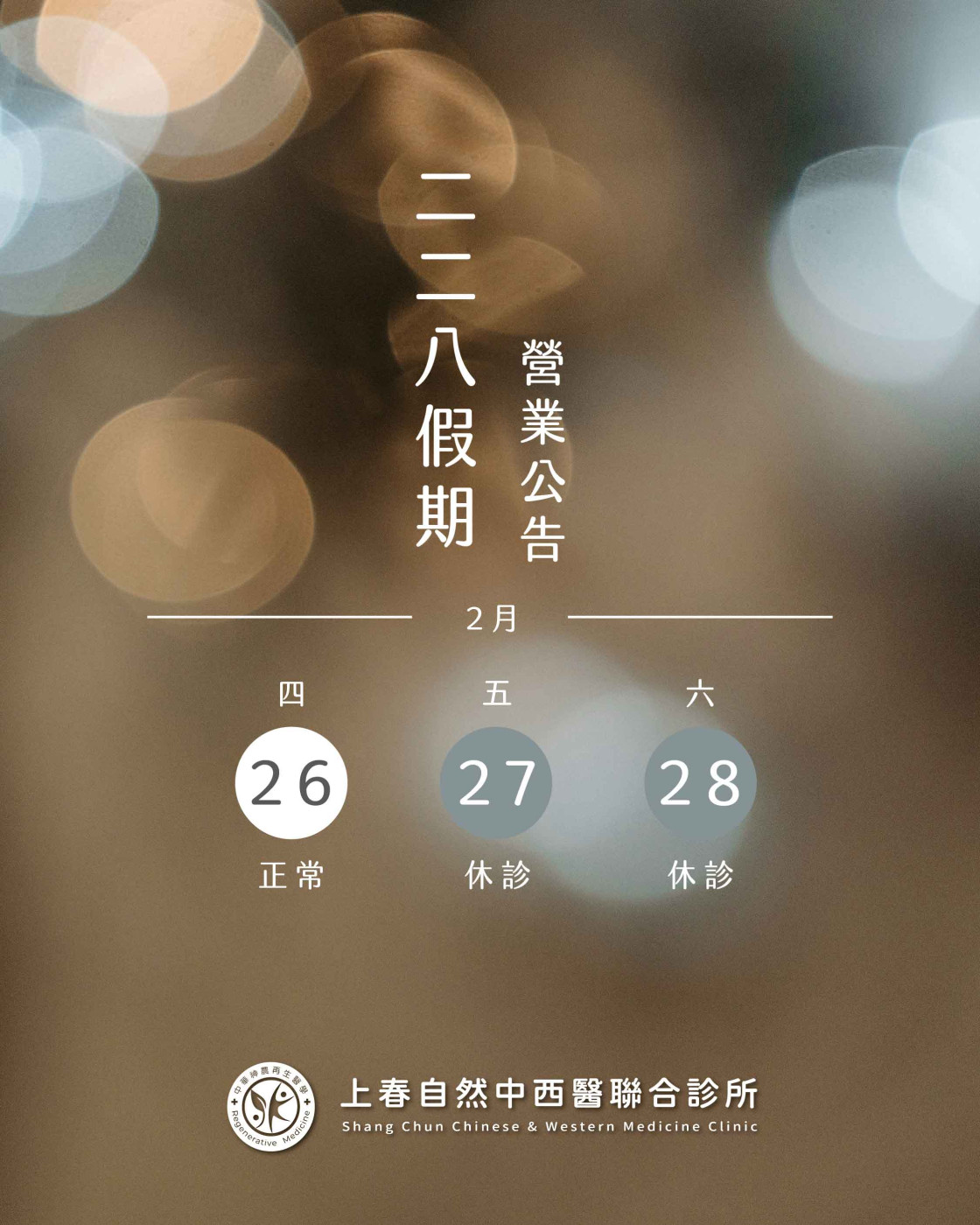 親愛的朋友,本診所將於 2/27(五)~3/1(日)和平紀念日期間休診,並於 3/2(一)恢復正常看診。