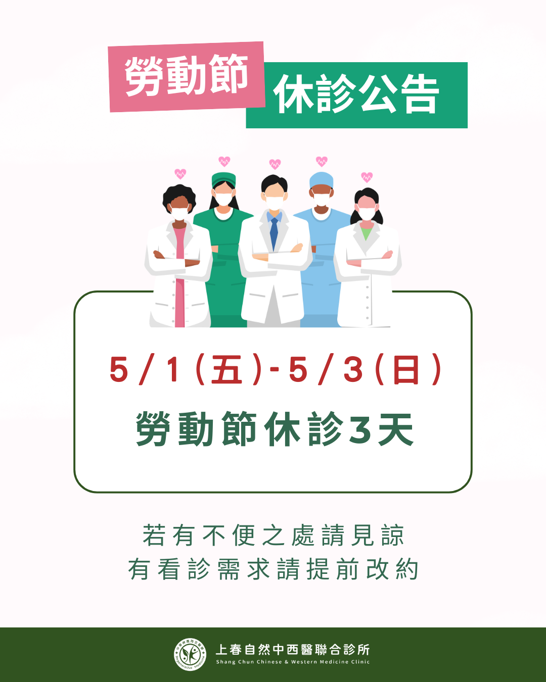 【公告】5/1 - 5/3 勞動節連假休診通知